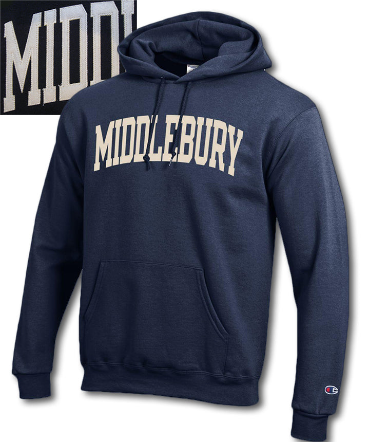 YOUTH Champion Middlebury "sewn letters" Hooded Sweatshirt. Antique Twill sewn on letters.